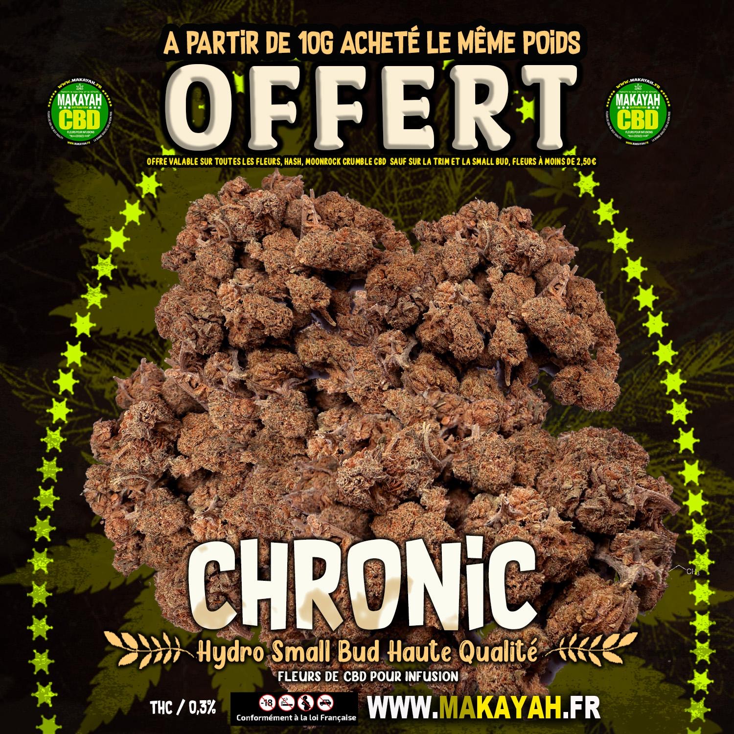 Le même poids offert en CHRONIC Hydro Small Bud à partir de 10g acheté* offre valable sur toutes les fleurs, hash, moonrocks et CBD sauf pour les produits inférieur à 2,50€/g